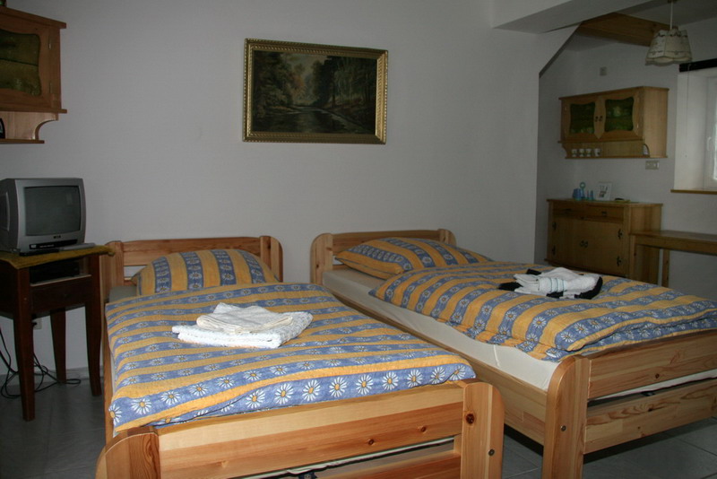 Die Zimmer im unteren Geschoss sind etwas kleiner als die Zimmer der Ferienwohnung. Trotzdem befindet sich in jedem Zimmer ein Kleiderschrank und ein Tisch mit Stühlen. Natürlich gibt es auch zu diesen Zimmern ein Bad. |